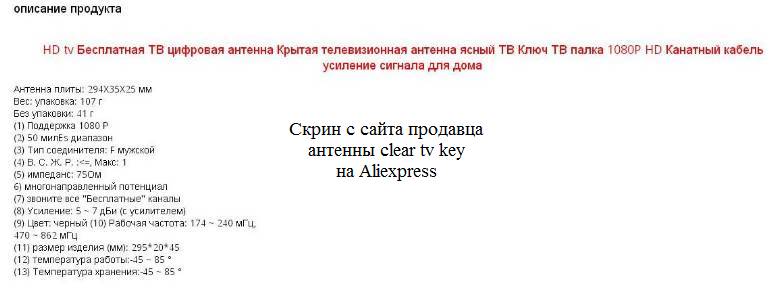 На всех подобных сайтах не приведены технические характеристики антенны Clear TV key, а в описание изобилуют сказочные обещания: прием сигнала со спутника, прием до 300 каналов и бесплатно, цифровое качество и прочие прелести сыра в мышеловке.
