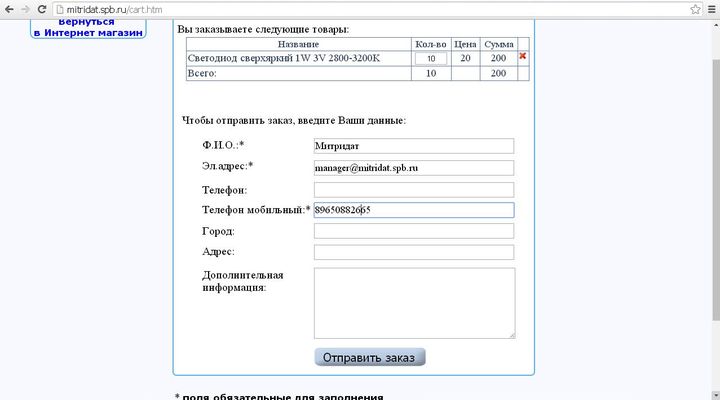 Шаг 5. Заполните регистрационную форму, вводя свои данные. Для отправки заказа нужно заполнить как минимум поля обязательные для заполнения.