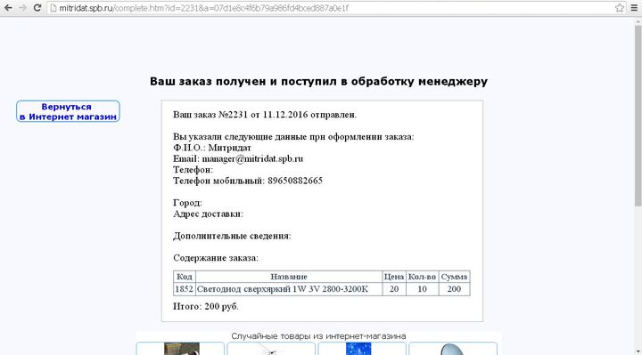 Шаг 6. После того как Вы нажали кнопку отправить заказ, перед Вами появится страница на которой будет указан номер Вашего заказа, Ваши данные и заказанный Вами товар.