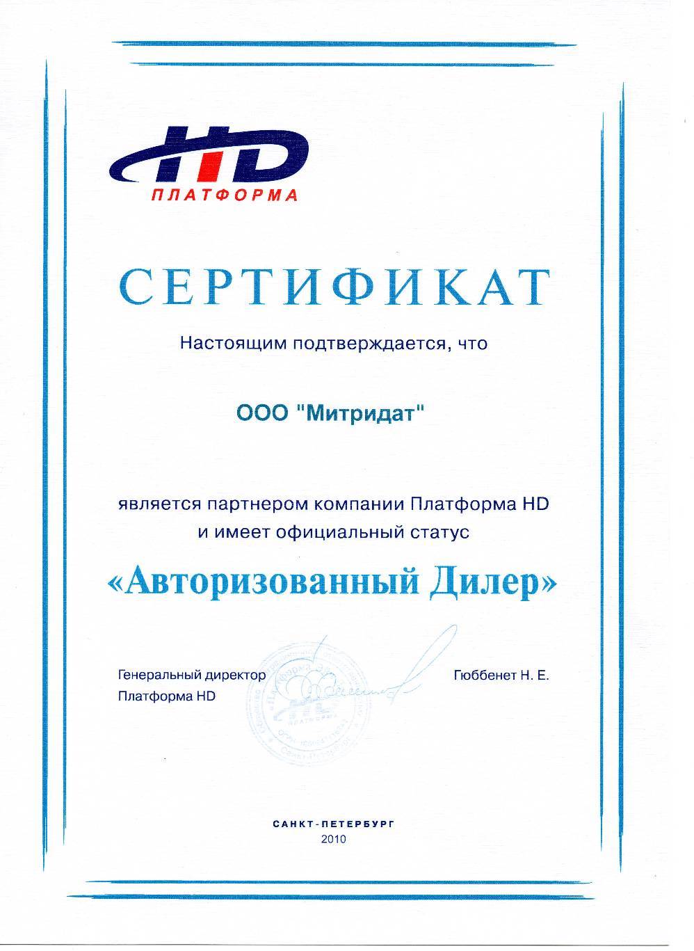 Сертификат Платформа HD